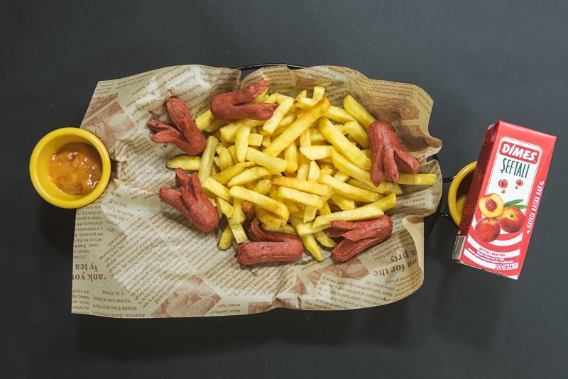 sosis-parmak patates ve seçeceğiniz meyve suyu ile servis edilir