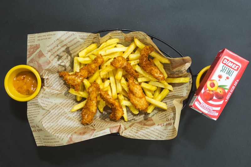 parmak patates-çıtır tavuk- seçeceğiniz meyve suyu ile birlikte servis edilir