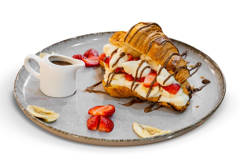 taze çilek-muz-özel manifest kreması ve kruvasanın eşsiz buluşması (çikolata sos ile servis edilir)